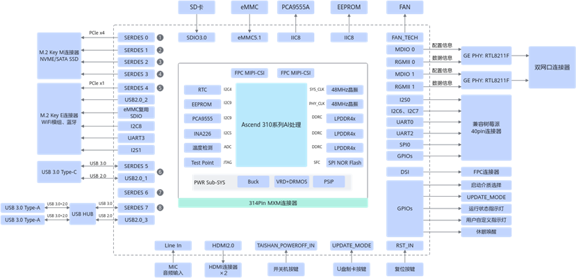 CPU :為 Ascend 310 AI 處理器,1個DaVinciV300 AI core(主頻500MHz),4個TAISHANV200M處理器核(主頻1.0GHz); 內(nèi)存:8GB LPDDR4X內(nèi)存,64bit位寬; 算力:半精度(FP16):4TFLOPS,整數(shù)精度(INT8):8TOPS; 存儲:配備8GB LPDDR4X內(nèi)存,可外接最高256GB Micro SD; 核心擴展: 40Pin擴展接口:1個; USB Type A接口:2個; HDMI接口:2個; USB Type C接口:1個; Micro SD卡接口:1個; MIPI-CSI連接器:2個,8Lane; 風扇接口:1個; 千兆網(wǎng)口:1個; |