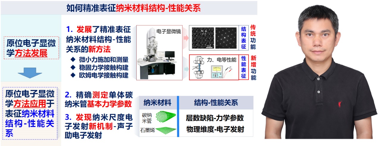如何精準(zhǔn)建立納米材料的結(jié)構(gòu)-性能關(guān)系是低維納米材料研究的一個(gè)關(guān)鍵問題。納米材料具有性能對(duì)結(jié)構(gòu)和環(huán)境敏感、不同個(gè)體樣品之間結(jié)構(gòu)和性能經(jīng)常不同等特點(diǎn),基于不同樣品、不同設(shè)備分別表征結(jié)構(gòu)和性能的傳統(tǒng)方法難以精準(zhǔn)建立納米材料的結(jié)構(gòu)-性能關(guān)系。為此,本項(xiàng)目發(fā)展了一系列原位電子顯微學(xué)方法,解決了如何在電子顯微鏡中精確表征單體納米材料的力學(xué)、電學(xué)等物理性能的問題,實(shí)現(xiàn)了在同一設(shè)備環(huán)境下針對(duì)同一單體納米材料同時(shí)表征結(jié)構(gòu)和性能,提供了精準(zhǔn)表征納米材料結(jié)構(gòu)-性能關(guān)系的新方法,并通過此方法進(jìn)一步揭示了碳納米管、石墨烯等重要納米材料的結(jié)構(gòu)-性能關(guān)系,包括:精確測定了單體碳納米管的多個(gè)基本力學(xué)參數(shù),建立了力學(xué)參數(shù)與結(jié)構(gòu)的關(guān)系;在低維碳納米材料中發(fā)現(xiàn)了聲子助電子發(fā)射新機(jī)制,建立了物理維度與熱電子發(fā)射的關(guān)系等。研究成果為相關(guān)納米材料在納米電子器件等領(lǐng)域的應(yīng)用提供了重要結(jié)構(gòu)-性能關(guān)系的支撐,共發(fā)表SCI論文80余篇,5篇代表作共被SCI他引600余次。
