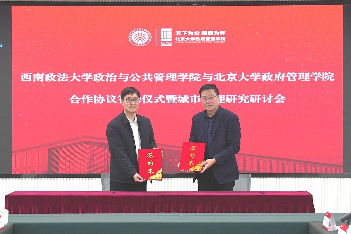 10月29日,西南政法大學(xué)科研處處長(zhǎng)張震,政治與公共管理學(xué)院黨委書記代莉平、院長(zhǎng)曾向紅一行訪問(wèn)北京大學(xué)政府管理學(xué)院。北大政府管理學(xué)院院長(zhǎng)燕繼榮、黨委書記李楊會(huì)見西南政法大學(xué)代表團(tuán)并在廖凱原樓召開座談會(huì),雙方簽署合作協(xié)議。西南政法大學(xué)政治與公共管理學(xué)院副院長(zhǎng)、重慶城市治理與發(fā)展研究院執(zhí)行院長(zhǎng)類延村,副教授王山,教師李修科、劉元賀,北京大學(xué)社會(huì)科學(xué)部副部長(zhǎng)郭琳,北大政府管理學(xué)院副院長(zhǎng)、教務(wù)部副部長(zhǎng)黃璜,長(zhǎng)聘副教授孫鐵山、劉倫,助理教授羅薇參加座談會(huì)。座談會(huì)由李楊主持。