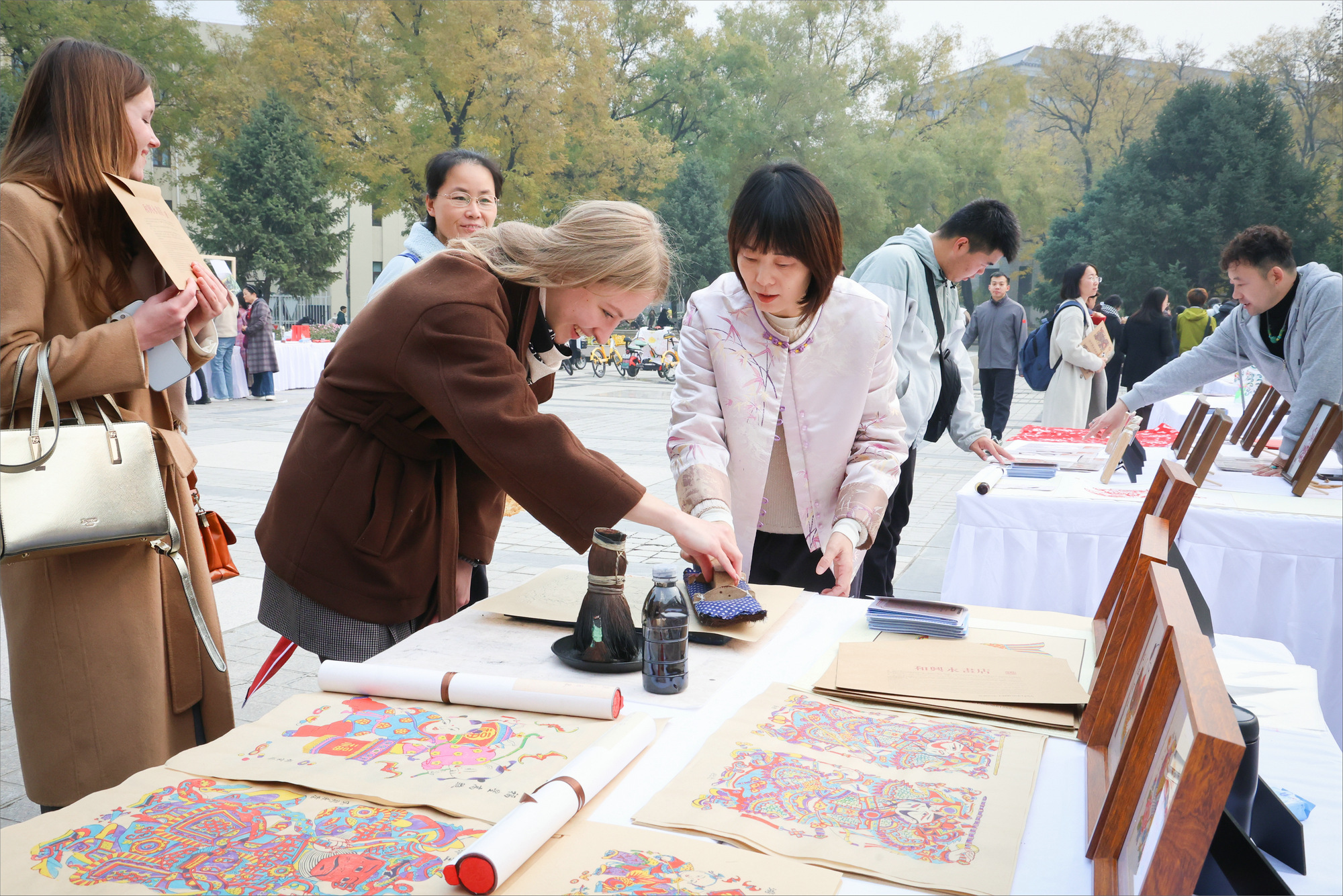 在非遺展區(qū)內(nèi),濰坊風(fēng)箏、木版年畫、紅木嵌銀、泥塑、剪紙、老貓花燈等傳統(tǒng)手工藝精品琳瑯滿目,諸城燒烤、隆盛糕點等地方美食非遺香韻流轉(zhuǎn)。靈動萌趣的“峱寶寶”“博物館濰坊象”等文創(chuàng)產(chǎn)品令師生忍俊不禁。借助VR技術(shù)打造的“濰坊風(fēng)箏博物館云游覽”體驗區(qū),讓師生“沉浸”于風(fēng)箏世界,感受非遺技藝在數(shù)字維度下的創(chuàng)新表達。活動還發(fā)布了“北京大學(xué)、濰坊聯(lián)名風(fēng)箏”,成為校地文化交融的生動見證。