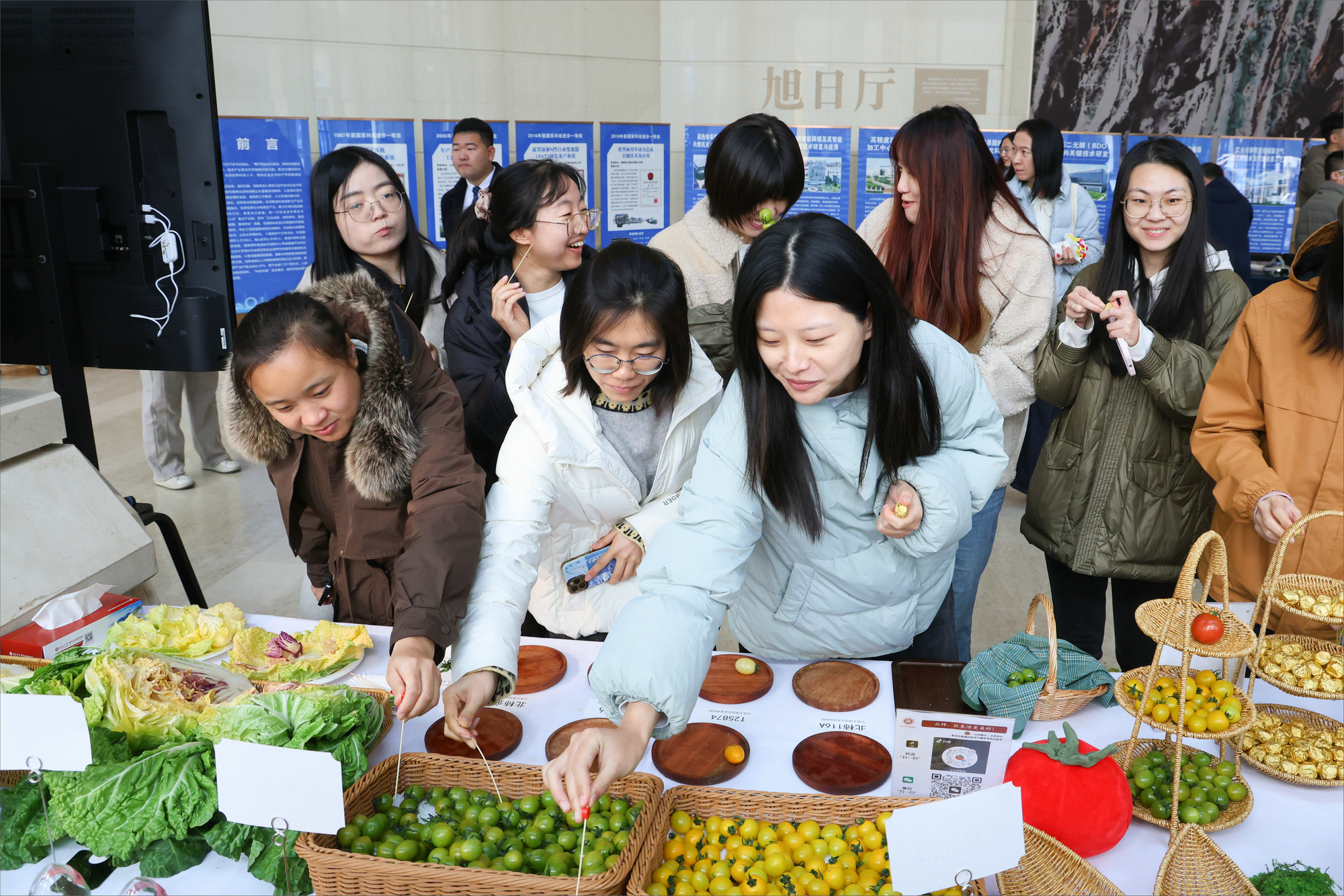 在科技展區(qū),由北京大學(xué)現(xiàn)代農(nóng)業(yè)研究院培育的五彩大白菜、“北柿”系列櫻桃番茄等特色農(nóng)產(chǎn)品繽紛亮相,吸引師生駐足品嘗。