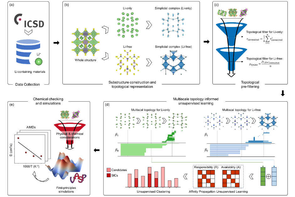作為一種將材料微觀結(jié)構(gòu)映射為數(shù)學(xué)圖模型的方法,圖論結(jié)構(gòu)化學(xué)近年來在材料基因組、催化活性探索等方向中表現(xiàn)出強大的表示和預(yù)測能力。北京大學(xué)深圳研究生院新材料學(xué)院潘鋒教授團隊長期致力于圖論結(jié)構(gòu)化學(xué)方法的拓展與應(yīng)用,并在該領(lǐng)域提出了一系列創(chuàng)新性工作,實現(xiàn)了材料結(jié)構(gòu)表示(J. Phys. Chem. Lett., 2023, 14: 954),材料的反向設(shè)計(npj Comput. Mater., 2025, 11: 147),新型固態(tài)電解質(zhì)的設(shè)計(J. Am. Chem. Soc. 2024, 146, 18535),化學(xué)反應(yīng)路徑搜索(CCS Chemistry 2024, 7, 1),催化活性相搜索(Nat Comm. 2025,16, 2542)。近日,潘鋒團隊聯(lián)合密歇根州立大學(xué)魏國衛(wèi)教授團隊,提出了一種融合代數(shù)拓撲建模與AI無監(jiān)督學(xué)習(xí)的多尺度拓撲學(xué)習(xí)(Multiscale Topological Learning, MTL)框架,用于系統(tǒng)識別和篩選固態(tài)鋰電池快離子導(dǎo)體材料。相關(guān)研究成果以題為“Superionic Ionic Conductor Discovery via Multiscale Topological Learning”的論文,發(fā)表于《美國化學(xué)會志》(Journal of the American Chemical Society,ACS)(2025, DOI: 10.1021/jacs.5c04828)。