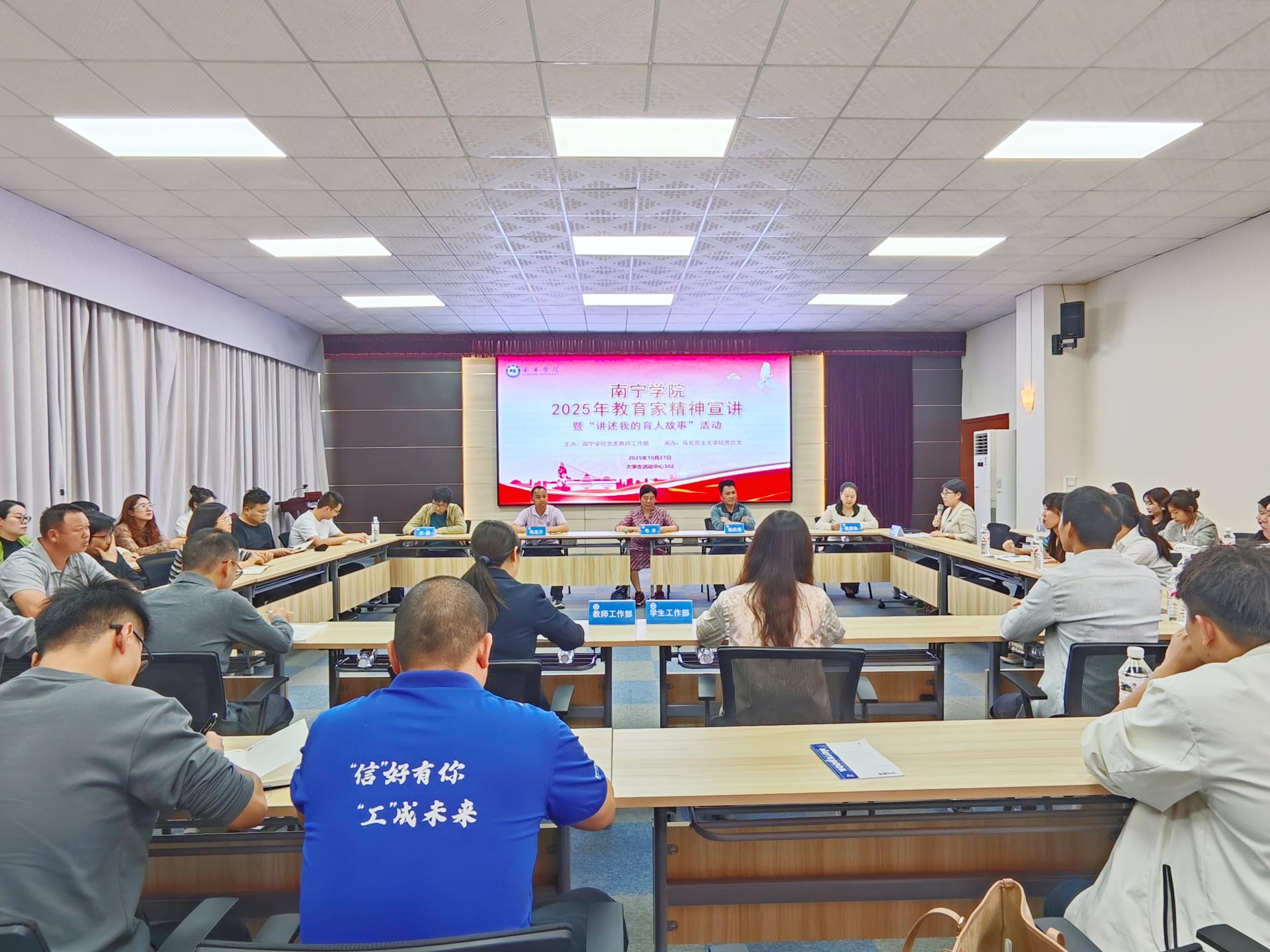 2025-11-02 09:15為深入學(xué)習(xí)貫徹總書記關(guān)于教育的重要論述,弘揚(yáng)教育家精神,加強(qiáng)新時(shí)代教師隊(duì)伍建設(shè),發(fā)揮樣板支部的戰(zhàn)斗堡壘作用,南寧學(xué)院黨委教師工作部聯(lián)合馬克思主義學(xué)院黨總支,于10月27日下午在大學(xué)生活動(dòng)中心302會(huì)議室成功舉辦南寧學(xué)院2025年教育家精神宣講暨“講述我的育人故事”活動(dòng);顒(dòng)特邀質(zhì)量評估與督導(dǎo)處韋平教授、信息工程學(xué)院陳積常教授、馬克思主義學(xué)院張連云副教授、教育學(xué)院樊原朱副教授、交通運(yùn)輸學(xué)院王磊副教授作為分享嘉賓。黨委教師工作部、學(xué)生工作部有關(guān)同志以及各二級學(xué)院專任教師、輔導(dǎo)員代表共40余人參加活動(dòng)。活動(dòng)由馬克思主義學(xué)院黨總支副書記張雪嬌主持。